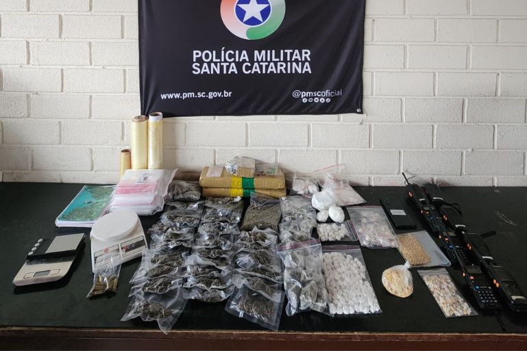 No local, foram apreendidos 2,372 quilos de maconha, 749 gramas de haxixe, 530 gramas de cocaína, 158 gramas de crack, 43 micropontos de LSD, dois comprimidos de ecstasy, três balanças de precisão, oito rádios comunicadores Baofeng, um telefone celular, onze munições de calibres 32 e 38, além de dois cadernos com anotações sobre o tráfico e diversas embalagens plásticas usadas no preparo e comercialização das drogas.