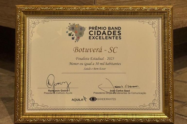 Botuverá novamente se destaca entre os municípios catarinenses que apresentam as melhores práticas de gestão pública. O município foi reconhecido como finalista do Prêmio Band Cidades Excelentes 2025, promovido pela TV Barriga Verde (TVBV) em parceria com o Instituto Áquila e o Grupo Bandeirantes. A cerimônia, realizada em Florianópolis, premiou iniciativas que alcançaram os melhores indicadores com base no IGMA – Índice de Gestão Municipal Aquila, metodologia que avalia eficiência, qualidade dos serviços, inovação e desenvolvimento sustentável.