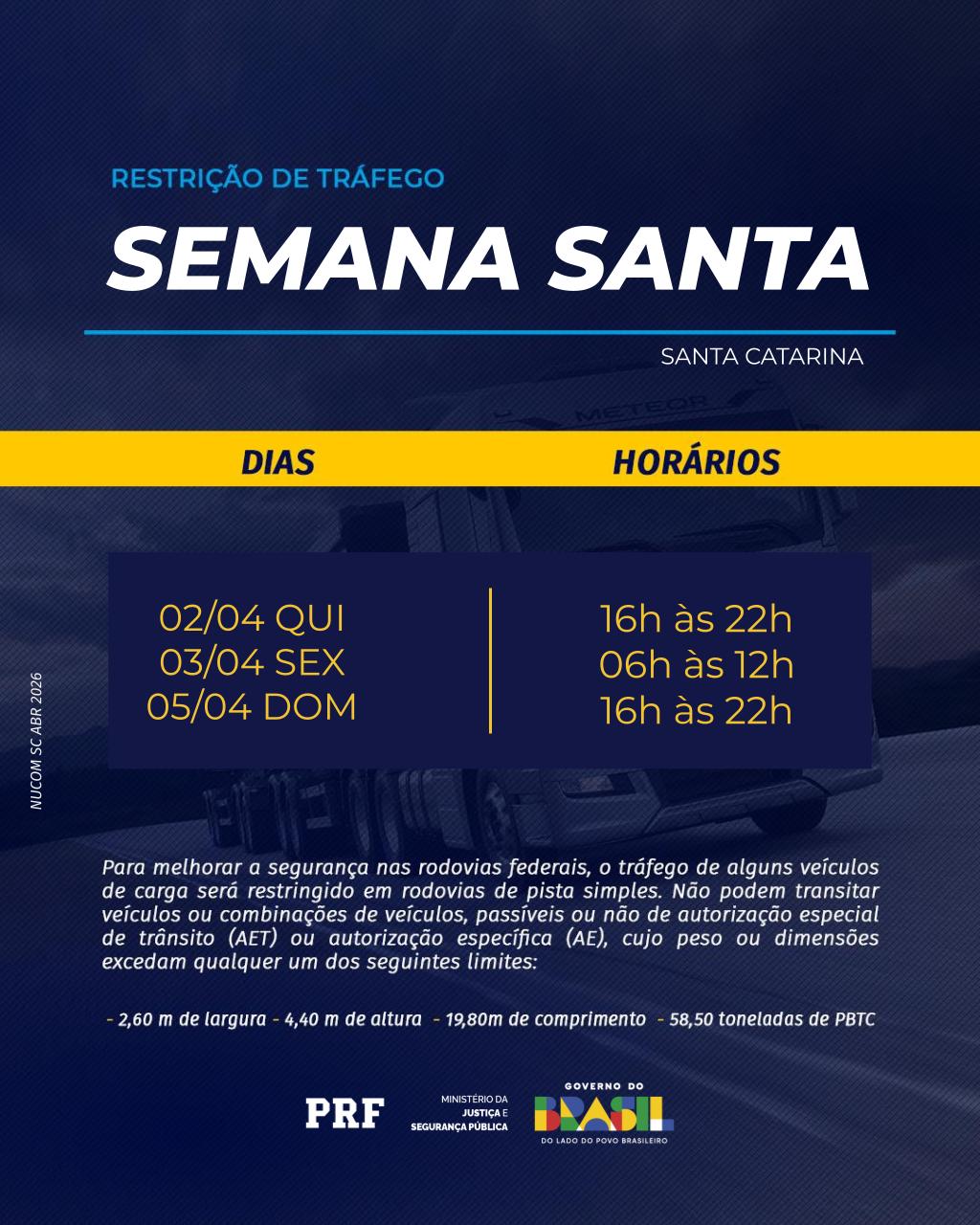 A Polícia Rodoviária Federal (PRF) iniciou à zero hora desta quinta-feira (2), em todo o Brasil, a Operação Semana Santa 2026. A mobilização termina no domingo, dia 05 de abril, às 23h59min.
