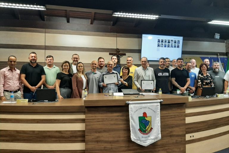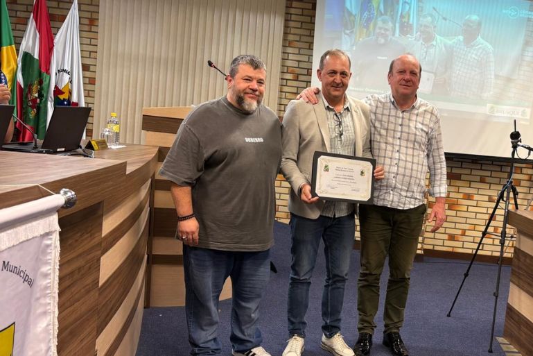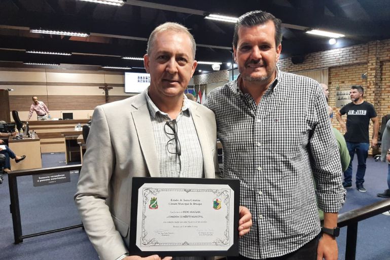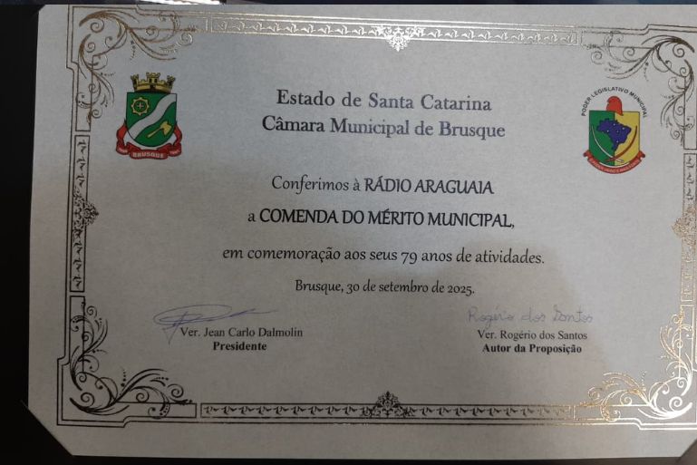 Na tarde desta terça-feira (30/9), a Rádio Araguaia de Brusque foi homenageada pela Câmara Municipal de Brusque com a Comenda do Mérito, em reconhecimento aos seus 79 anos de atividades ininterruptas no rádio catarinense. A distinção foi entregue ao diretor da emissora, Marcos Gelain, durante sessão do legislativo municipal.
