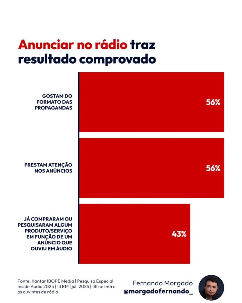 O rádio continua sendo uma das mídias mais fortes, confiáveis e eficientes do Brasil — e isso agora está mais uma vez comprovado por dados. Uma pesquisa divulgada pelo consultor Fernando Morgado e realizada pela Kantar IBOPE Media mostra que mais da metade dos ouvintes presta atenção à publicidade no rádio, e 43% já compraram ou pesquisaram um produto após ouvir um anúncio em áudio.