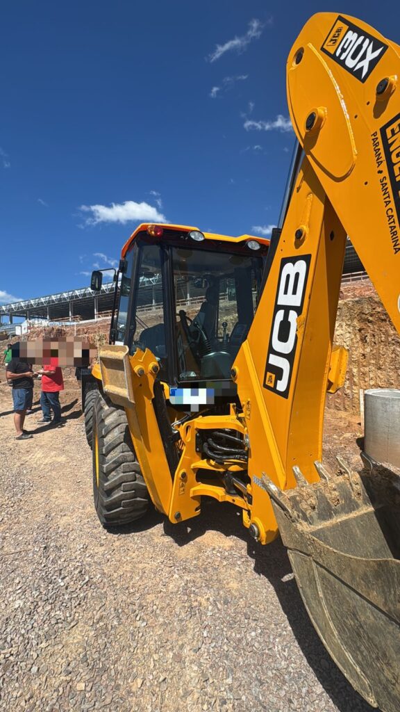 Durante a manobra, houve a colisão. A retroescavadeira atingiu a lateral do carro.