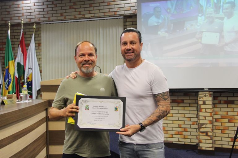 Na sessão desta terça-feira (7), a Câmara de Vereadores de Brusque entregou ao senhor Aldo Maes dos Anjos a comenda do Mérito Profissional, em reconhecimento aos 24 anos de publicações da revista Cartum Interativa, de sua autoria. A homenagem foi proposta pelo vereador André Rezini.