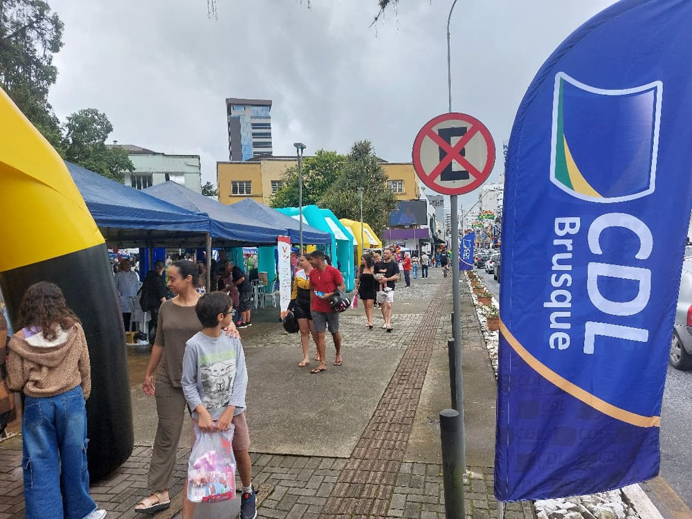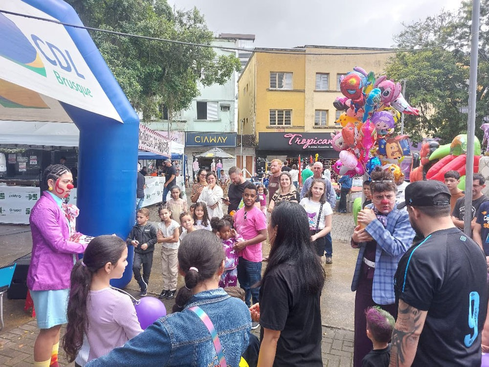 O tempo instável de sábado, 11 de outubro, não impediu que dezenas de famílias marcassem presença na edição mensal do Sábado Fácil, promovida pela Câmara de Dirigentes Lojistas de Brusque (CDL Brusque). Com uma programação especial, alusiva ao Dia das Crianças, pais e familiares aproveitaram para desfrutar das ações na Praça Barão de Schneeburg, levando diversão e atividades recreativas para crianças.