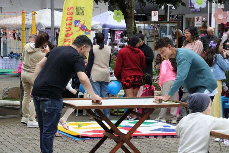 O comércio local atendeu em horário estendido, até as 17h, e quem passou pelo Centro de Brusque pôde aproveitar brinquedos como cama elástica, atrações culturais e apresentações musicais.