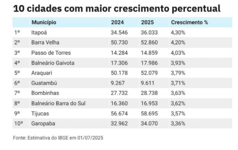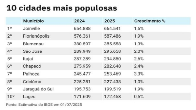 Embora Brusque esteja fora das dez maiores cidades do estado, o município também apresentou crescimento populacional na comparação com o Censo de 2022. De acordo com o IBGE, a população estimada em Brusque é de 155.307 em 2025.