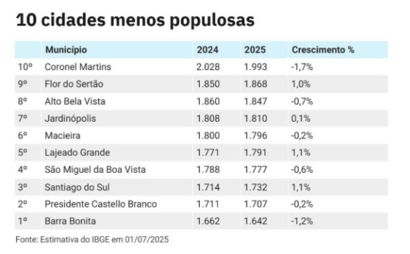 O IBGE também divulgou a estimativa populacional dos 295 municípios catarinenses. Joinville continua sendo o município mais populoso, com 664,5 mil. Já a cidade com menos habitantes é Barra Bonita, no extremo Oeste, com 1.642 habitantes. Itapoá foi o município catarinense que mais