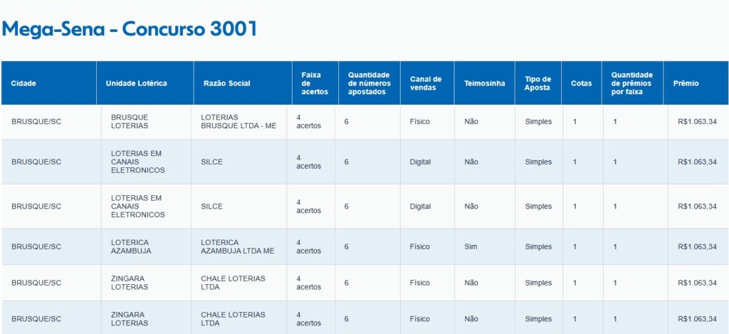 De Brusque, seis apostas acertaram quatro dezenas. Duas delas foram feitas pela internet, uma na Brusque Loterias, uma na Lotérica Azambuja e duas na Zíngara Loterias. Cada uma fatura o valor de R$ 1.063,34