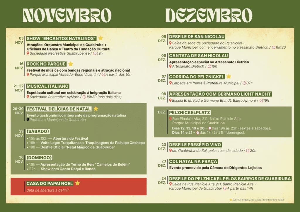 “Teremos carro alegórico, presença do Papai Noel e o nosso querido Pelznickel encerrando o desfile. Além disso, haverá a Tenda Delícias de Natal, com gastronomia típica e shows musicais.”