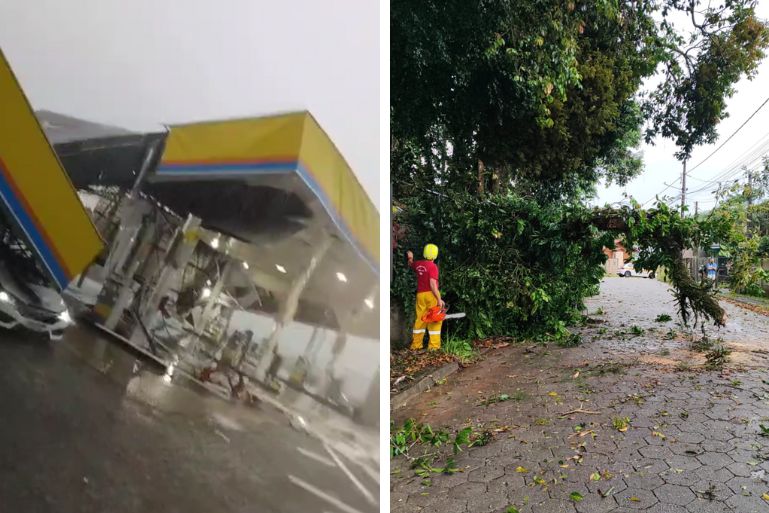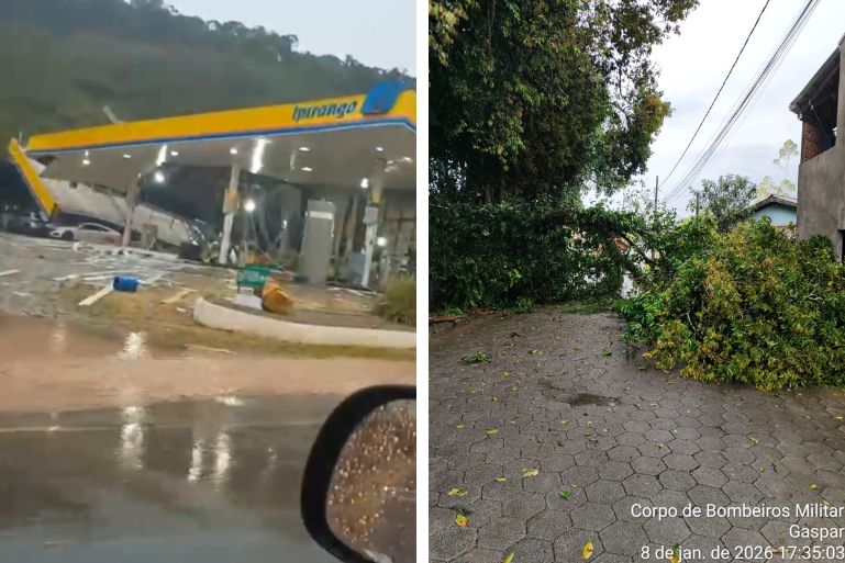 O temporal registrado na tarde desta quinta-feira (8) causou o desabamento da cobertura de um posto de combustíveis em Gaspar. A estrutura cedeu por completo e caiu sobre veículos que estavam estacionados no local.