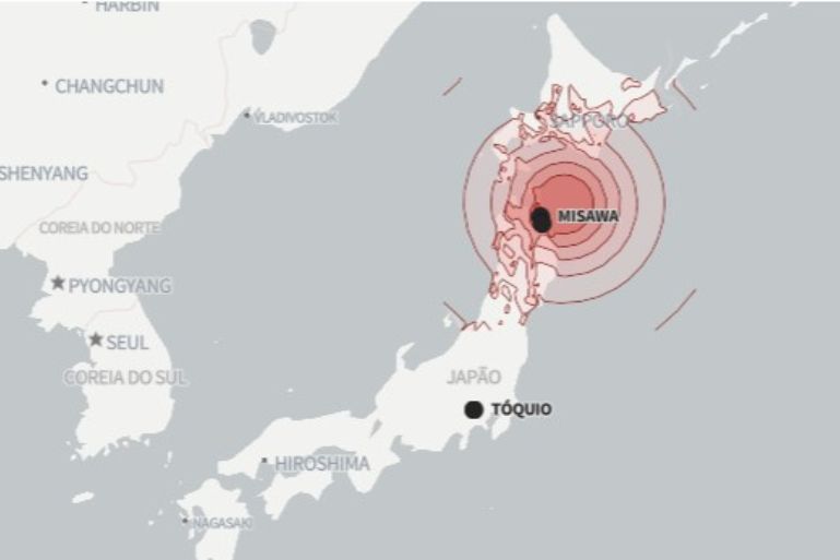 Um terremoto de magnitude 7,6 atingiu a região nordeste do Japão nesta segunda-feira (8). O tremor ocorreu às 23h15 no horário local (11h15 no horário de Brasília), com epicentro localizado no mar, a cerca de 80 quilômetros da cidade de Misawa, na província de Aomori.