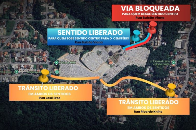 Para melhorar a fluidez do tráfego e evitar congestionamentos, será proibido estacionar nas vias próximas ao cemitério. A Setram instalará placas de sinalização nas ruas Bulcão Viana, Ricardo Knihs e José Erbs, e a fiscalização contará com o acompanhamento da Guarda de Trânsito de Brusque (GTB).