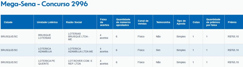 De Brusque, três apostas acertaram quatro dezenas. Todas elas foram feitas em lotéricas da cidade. Cada uma recebe o valor de R$ 765,10. Confira os detalhes: