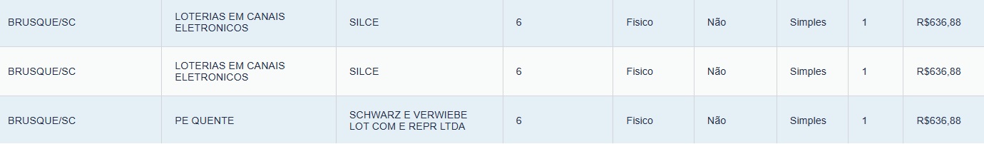 De Brusque, três apostas acertaram quatro números. Duas apostas foram realizadas através da internet e outra na Pé Quente.