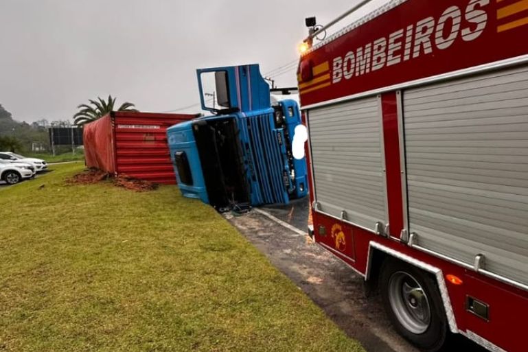 Na manhã desta segunda-feira (6/10), um caminhão tombou na Rodovia Ivo Silveira, no bairro Bateas, em Brusque. O acidente mobilizou equipes do Corpo de Bombeiros que atuaram no resgate das vítimas e na segurança da via.