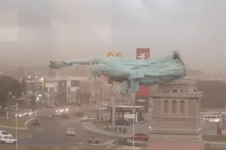 A réplica da Estátua da Liberdade, que ficava em frente à loja da Havan em Guaíba, na Região Metropolitana de Porto Alegre, desabou na tarde desta segunda-feira (15) durante o temporal que atinge o Rio Grande do Sul.