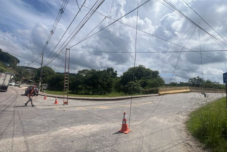 Ao chegar, a equipe confirmou o problema no cruzamento das ruas Alberto Müller e Bertha Schroeder, no bairro Limeira. A fiação, arrebentada e espalhada sobre a pista, representava risco a quem passava pelo trecho.