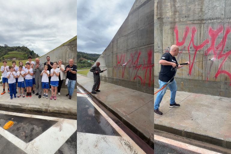 Um ato de vandalismo cometido em uma ponte recém-construída em Brusque mobilizou a comunidade nesta semana. Após pichações no local, o empresário Luciano Hang, o prefeito André Vechi e alunos da Escola Cultura se reuniram para realizar uma ação de limpeza e enviar uma mensagem clara: Brusque não aceita a degradação dos espaços públicos.