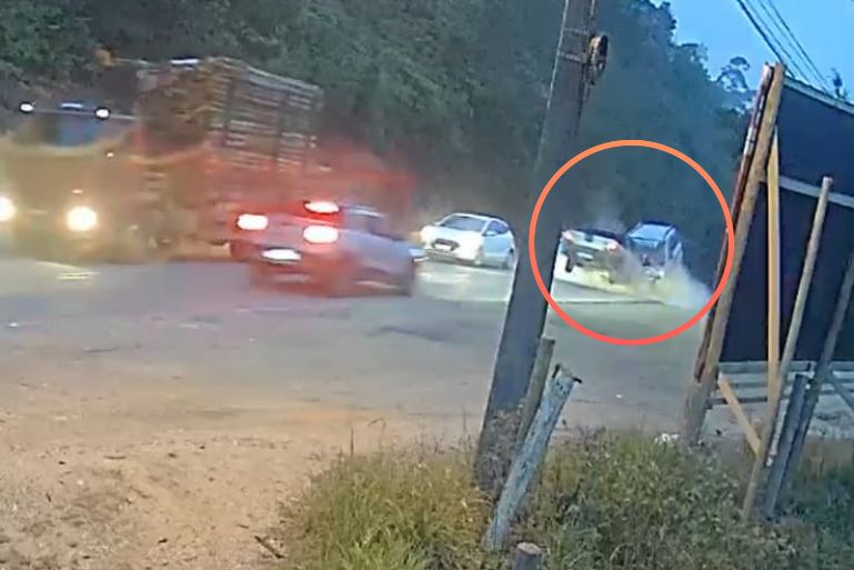 Uma câmera de segurança flagrou o exato momento de uma colisão envolvendo três veículos na rodovia Gentil Battisti Archer, próximo ao Sítio do PIME, na divisa entre Brusque e Nova Trento. O acidente aconteceu por volta das 5h30min da manhã desta segunda-feira (1º) e mobilizou equipes do Corpo de Bombeiros de Brusque.
