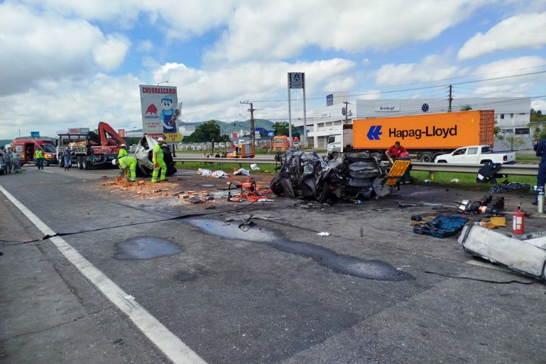 Um grave acidente mobilizou equipes do Corpo de Bombeiros na manhã desta quarta-feira (18), na BR-101, no bairro Salseiros, em Itajaí. A ocorrência foi registrada às 8h29 e envolveu quatro veículos, deixando três pessoas mortas e um menor ferido.