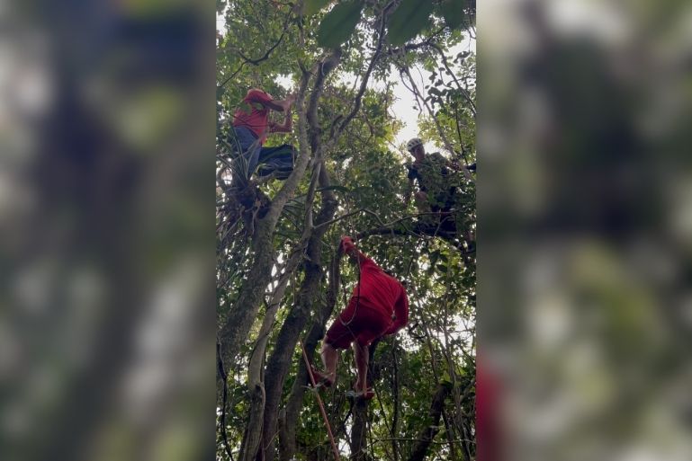 Equipes dos bombeiros foram mobilizadas e seguiram por trilha em meio à vegetação até localizar a vítima. O homem estava preso a cerca de seis metros de altura, enroscado nos velames do equipamento e sustentado pela copa das árvores.