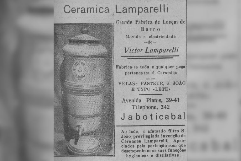 Propaganda da Cerâmica Lamparelli, com foto do Filtro São João. Fonte: Diário de Jaboticabal (1938).