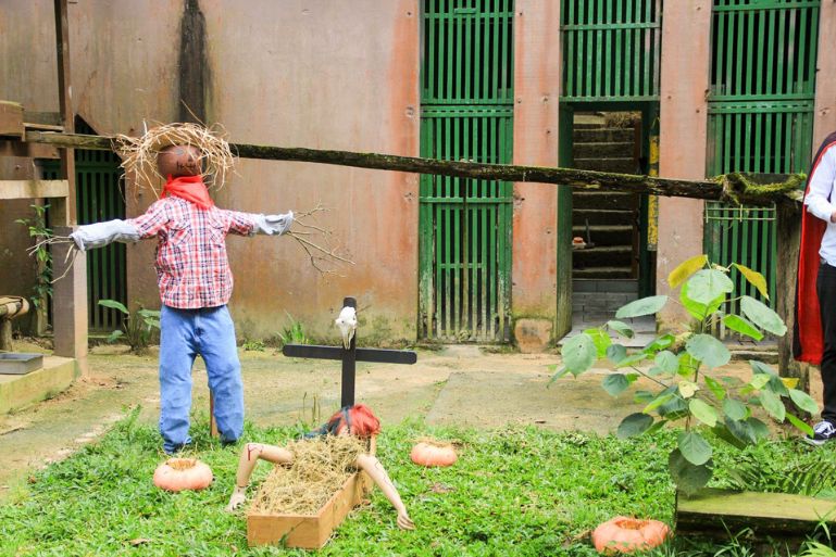 Durante a ação, o recinto dos cachorros-do-mato foi decorado com espantalhos, abóboras e caixões de papelão, em alusão ao Dia das Bruxas, comemorado na sexta-feira (31).